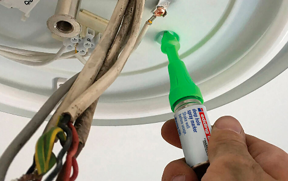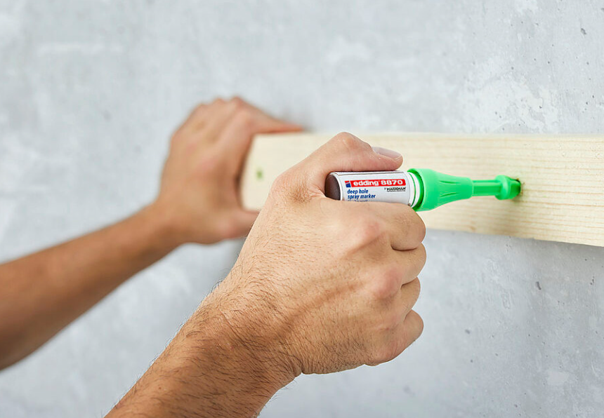 Встряхните спрей маркер для труднодоступных мест. Поверните ограничитель на колпачке и разместите так, чтобы он мог войти в паз. Поместите наконечник маркера в просверленное отверстие, а затем надавите на маркер. Зеленым мелом на поверхность будет нанесена маркировка. Используйте маркировку для точного сверления. Неоновый зеленый мел легко стирается, не оставляя следов.